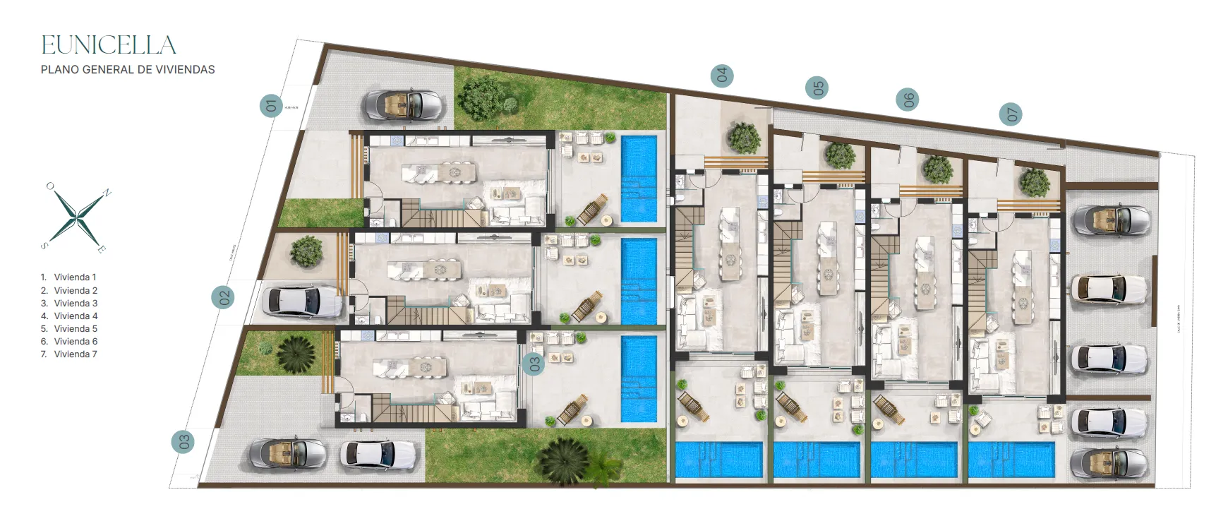 En una ubicación privilegiada, Eunicella presenta 7 villas exclusivas que combinan la arquitectura blanca tradicional con un diseño contemporáneo y acabados de alta calidad. Cada una cuenta con 3 DORMITORIOS, 2 BAÑOS y 1 ASEO, además de un luminoso SALÓN-COMEDOR con COCINAABIERTA que conecta con el jardín, donde la PISCINA PRIVADA en planta baja se encuentra a solo unos pasos, con acceso directo desde el salón.